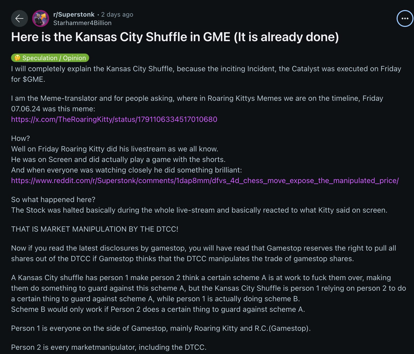 Kansas City Shuffle in GameStop Trading The "Kansas City Shuffle" is a strategy where Roaring Kitty led market manipulators to believe they were executing one trading strategy, while covertly implementing another. This maneuver began with a live stream on June 7, 2024, during which Roaring Kitty played a game that seemingly influenced GameStop's stock movements. The stock experienced halts, purportedly triggered by actions during the livestream, which Roaring Kitty and GameStop's management anticipated and exploited.